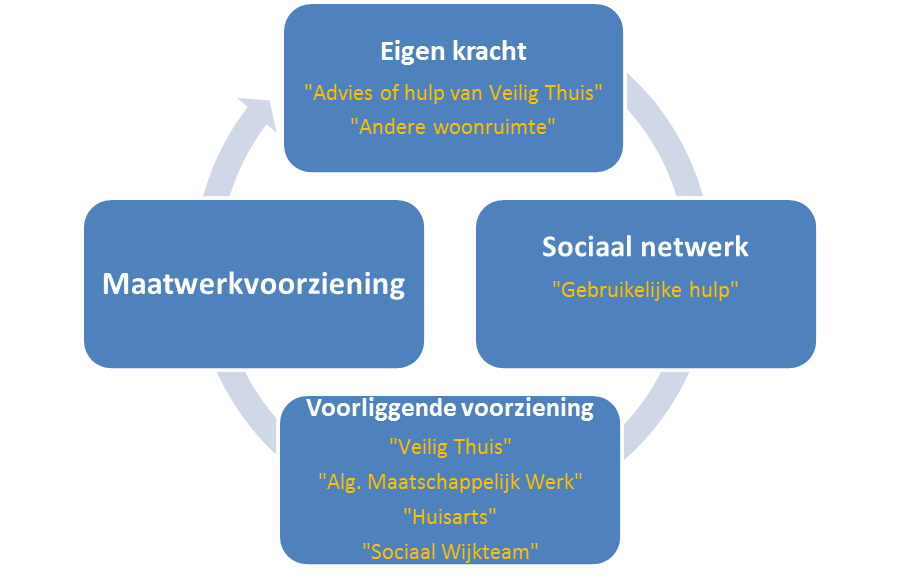 De burger kan gebruik maken van verschillende voorliggende voorzieningen indien sprake is van huiselijk geweld, kindermishandeling, eerwraak of loverboyproblematiek. Voorliggende voorzieningen zijn onder andere Veilig Thuis, het sociaal wijkteam, online advies en zelfhulp, de huisarts en het algemeen maatschappelijk werk.