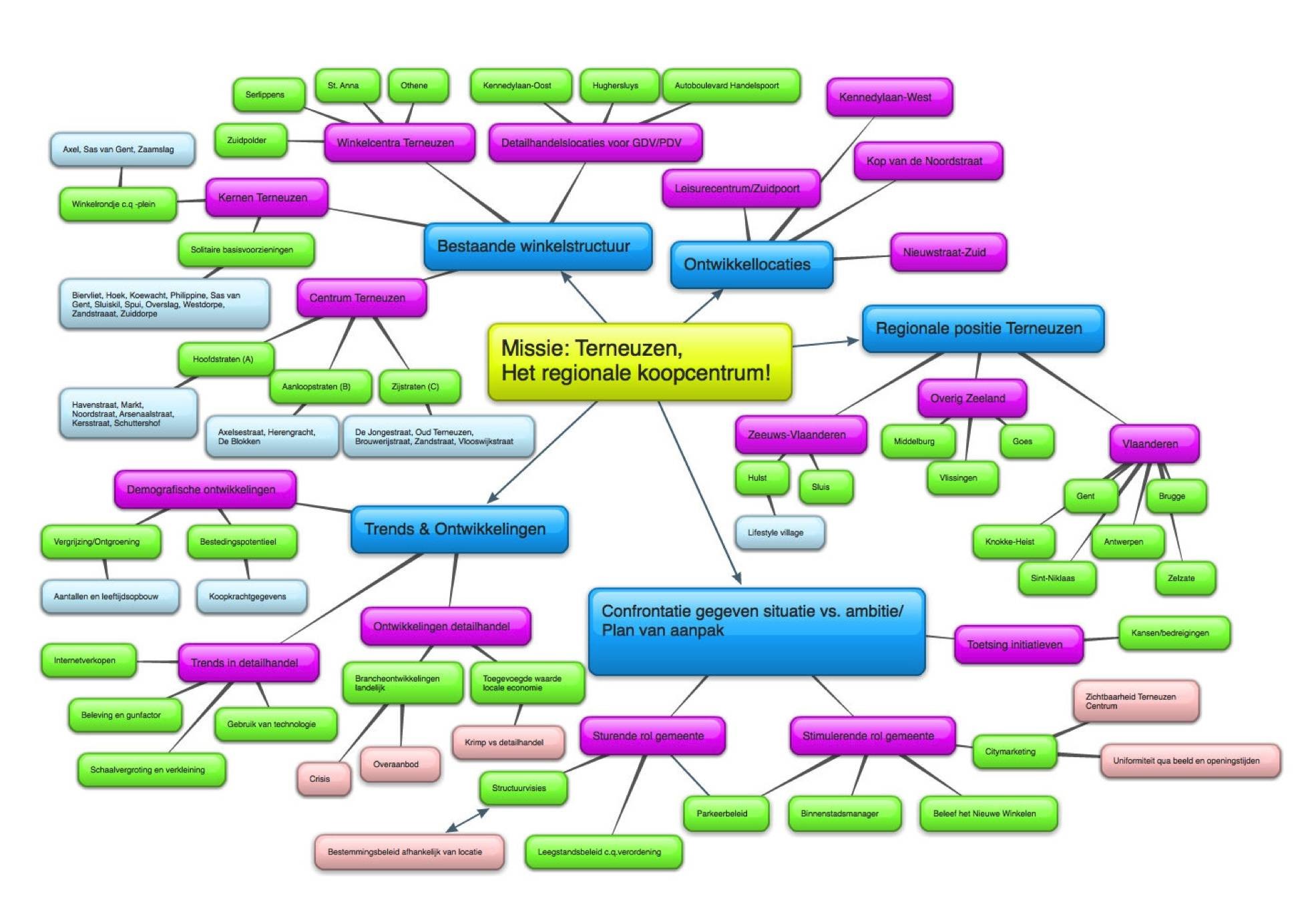 Hoofdstuk 2 behandelt de ontwikkelingen en trends die invloed hebben op het retaillandschap. Hoofdstuk 3 gaat in op het belang van detailhandel voor Terneuzen. Hoofdstuk 4 besteedt aandacht aan de verschillende schaalniveaus waarin Terneuzen te plaatsen is. Tevens worden de verschillende winkellocaties daarin geduid. Hoofdstuk 5 omvat beleid voor internetwinkels, detailhandel aan huis en op bedrijventerreinen. In hoofdstuk 6 treft u de visie, missie en strategische doelstellingen aan. Hoofdstuk 7 omvat het plan van aanpak. De laatste 2 hoofdstukken omvatten het nawoord en het bronnenoverzicht. Deel 1 (hoofdstukken 2 t/m 5) is bedoeld voor de lezer die behoefte heeft aan meer inzicht en diepgang in de retailproblematiek. Deel 2 (hoofdstukken 6 en 7) gaat direct in op de marsroute (welke richting kiezen we?) en het plan van aanpak (en wat kunnen we dan doen?). Indien gesproken wordt over Terneuzen zonder specifieke aanduiding van de hoedanigheid wordt hier het kernwinkelgebied Terneuzen bedoeld. Lezers die in een oogopslag een overzicht van deze detailhandelvisie willen krijgen, kunnen de mindmap in bijlage 1 raadplegen. Deze mindmap heeft als vertrekpunt gediend.