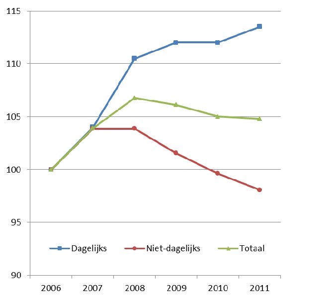 ‘In figuur 1 op de volgende bladzijde is de ontwikkeling van de bestedingen in de detailhandel weergegeven naar sector. Hieruit valt af te leiden dat vooral de winkelbestedingen aan niet-dagelijkse goederen de laatste jaren zijn teruggelopen na een snelle stijging tot 2008. De winkelbestedingen aan dagelijkse goederen zijn de afgelopen jaren min of meer gelijk gebleven. Het verschil in ontwikkeling van de winkelbestedingen tussen beide sectoren kent twee oorzaken: