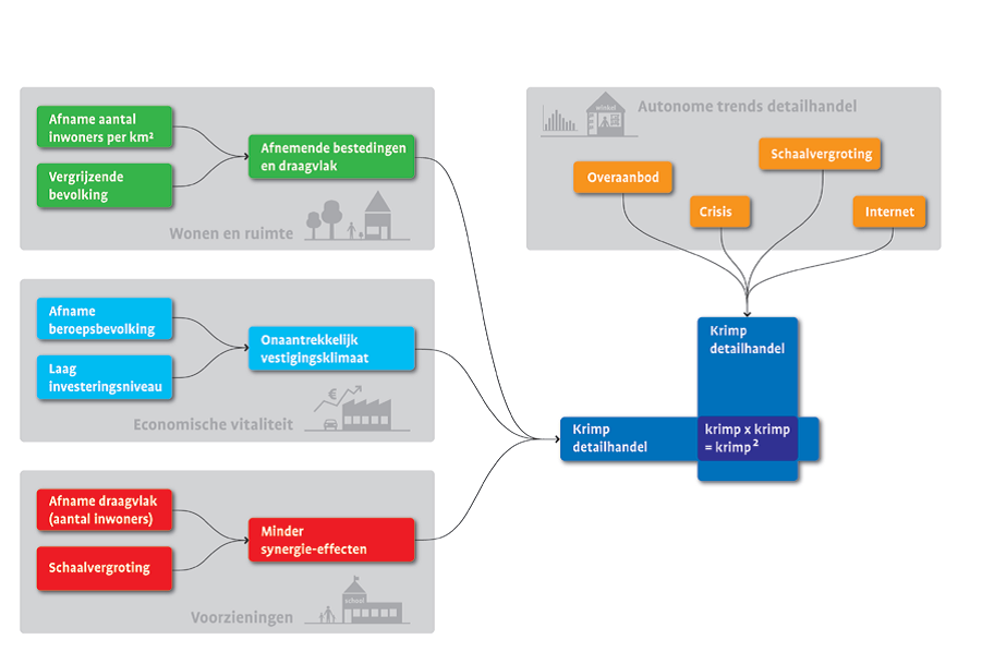 Een kleiner aantal inwoners leidt automatisch tot minder bestedingen (draagvlak). Ook de vergrijzing heeft een negatief effect op de bestedingen in winkels, vooral op de bestedingen in niet-dagelijkse artikelen (kleding, sport en spel, meubelen, doe-het-zelf, etc.).