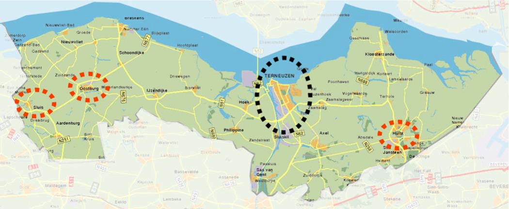 Terneuzen is de grootste centrumgemeente binnen de regio Zeeuws-Vlaanderen. Kleinere centrumgemeenten in Zeeuws-Vlaanderen zijn Hulst en Sluis. Deze twee gemeenten vormen samen met een aangrenzend deel in België aldus het secundaire verzorgingsgebied.