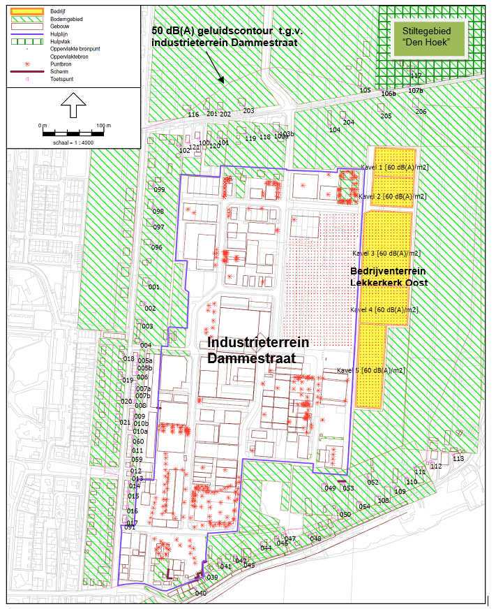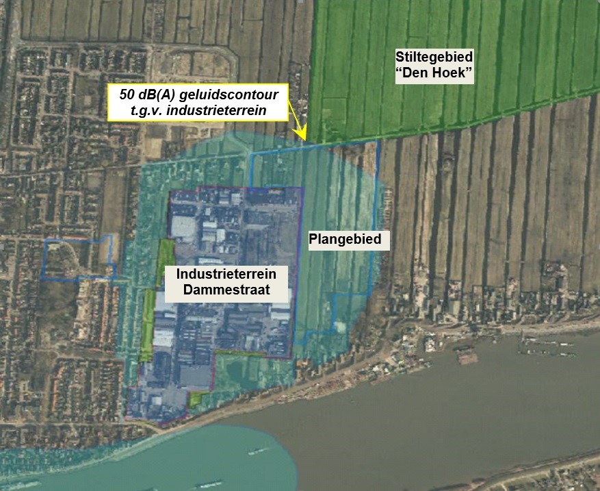 Op het industrieterrein Dammestraat mogen de zogenaamde grote lawaaimakers zich gaan vestigen. Om deze reden is conform artikel 40 van de Wet geluidhinder om dit industrieterrein op 6 maart 2001 door de raad van de gemeente Nederlek een nieuwe integrale geluidszone (50 dB(A)-contour) vastgesteld en in het vigerende bestemmingsplan opgenomen. De geluidszone vormt een aandachtsgebied tussen de bedrijven op het industrieterrein en de geluidsgevoelige gebouwen in de omgeving. Buiten deze zone mag de geluidsbelasting vanwege alle bedrijven op het industrieterrein tezamen niet hoger zijn dan 50 dB(A). In figuur 2 is een overzicht van de geluidszone weergegeven.