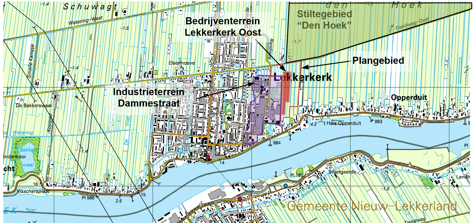 Het te ontwikkelen bedrijventerrein Lekkerkerk Oost heeft betrekking op een weidegebied direct aan de oostzijde aansluitend op het gezoneerde industrieterrein Dammestraat en ligt op enige afstand ten opzichte van het stiltegebied “Den Hoek” aan de noordzijde, de begraafplaats aan de oostzijde en de Opperduit aan de zuidzijde. Het nieuw te realiseren bedrijventerrein ligt binnen de geluidszone van het industrieterrein Dammestraat en vindt plaats op gronden die in het bestemmingsplan “Landelijk Gebied 1982” agrarisch zijn bestemd. Het bestemmingsplan dient te worden gewijzigd voor het realiseren van een nieuw bedrijventerrein. Figuur 1 geeft de situering van het bedrijventerrein Lekkerkerk Oost en de directe omgeving weer.