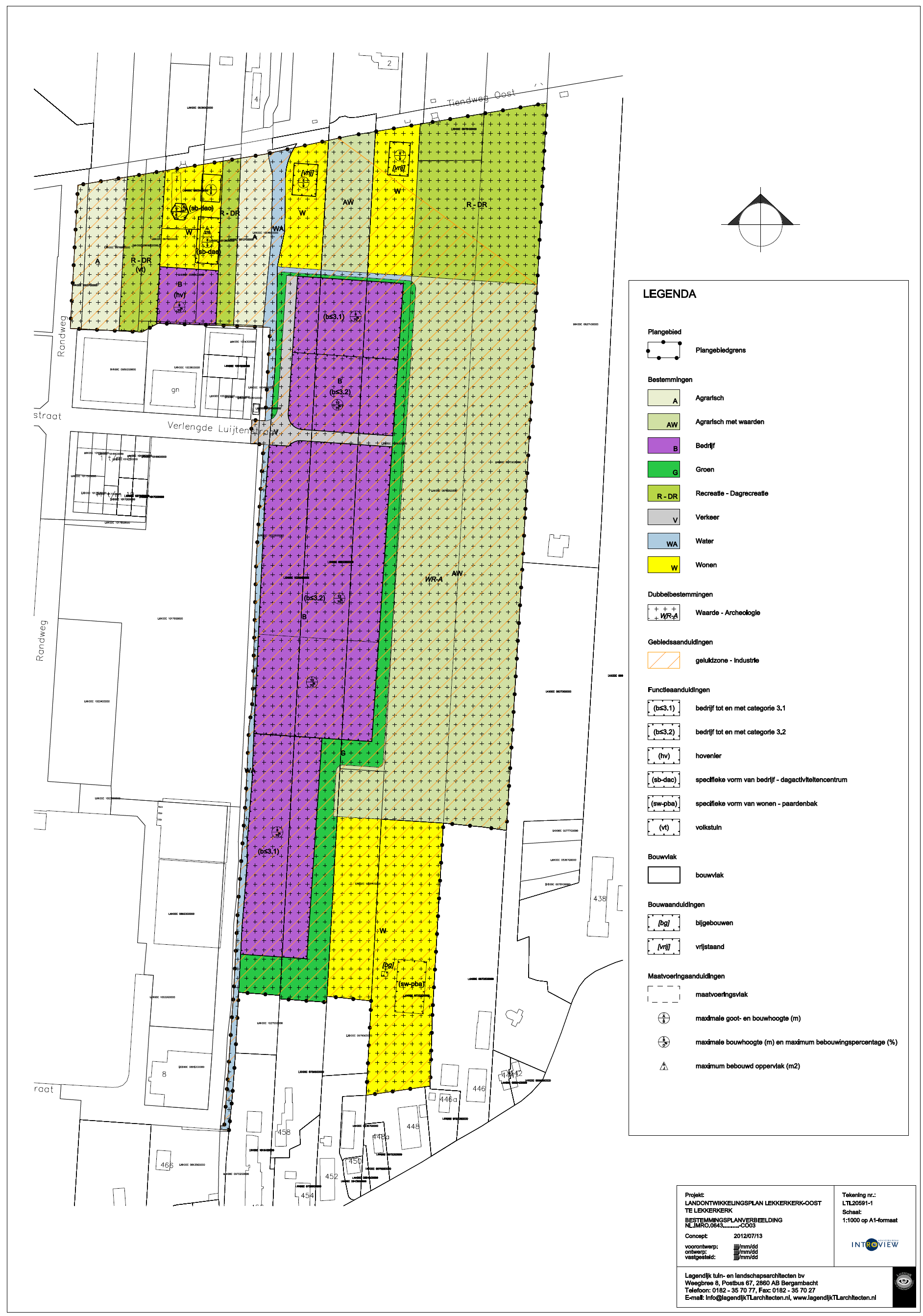In het rekenmodel is het bedrijventerrein Lekkerkerk Oost ingedeeld in een aantal kavels, in overeenstemming met de bestemmingsplankaart. De bestemmingsplankaart is weergegeven in figuur 1 van bijlage 1. Per kavel is tevens een gewenste bedrijfscategorie aangegeven. Op basis van de maximale situatie van het bestemmingsplan (de vestiging van categorie 3 inrichtingen) is aan een kavel een representatieve kental met betrekking tot de geluidsuitstraling gekoppeld. Afhankelijk van de grootte van de kavel kan zo per kavel aangegeven worden welke geluidsuitstraling verwacht kan worden.