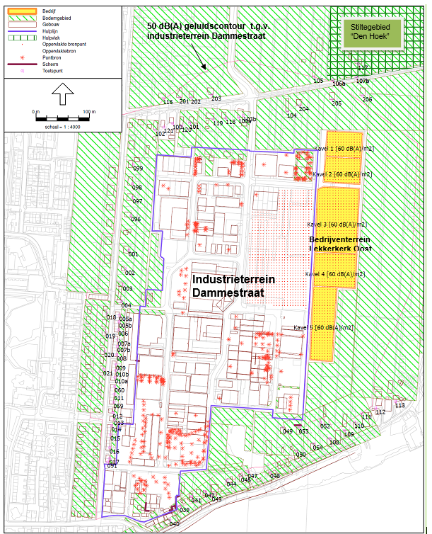met de gewenste kavelindeling wordt voldaan aan de uitgangspunten, te weten een etmaalwaarde van 55 dB(A) op de gevels van woningen binnen de geluidszone van het industrieterrein Dammestraat [met een vastgestelde MTG waarde van 55 dB(A)] en 50 dB(A) ter plaatse van de overige woningen die in de omgeving zijn gelegen.
