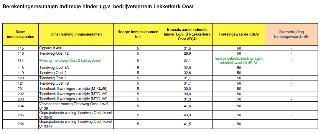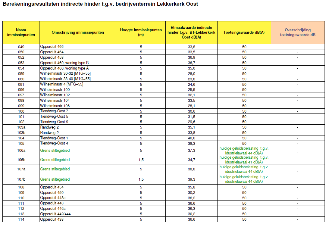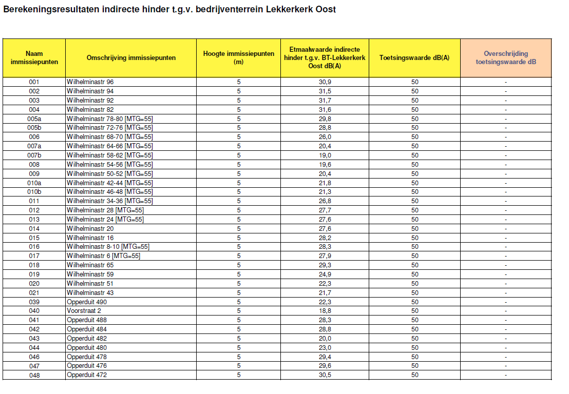 In bijlage 3 zijn de berekeningsresultaten op de beschouwde immissiepunten weergegeven. De immissiepunten zijn in figuur 3 van bijlage 1 weergegeven. Uit de berekeningsresultaten blijkt dat ten gevolge van de indirecte hinder de norm van 50 dB(A) etmaalwaarde ter plaatse van de woningen niet wordt overschreden.
