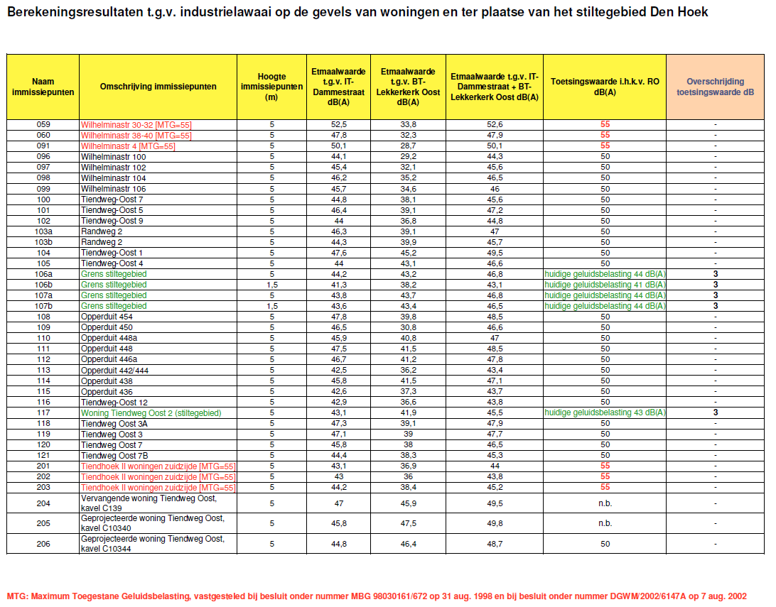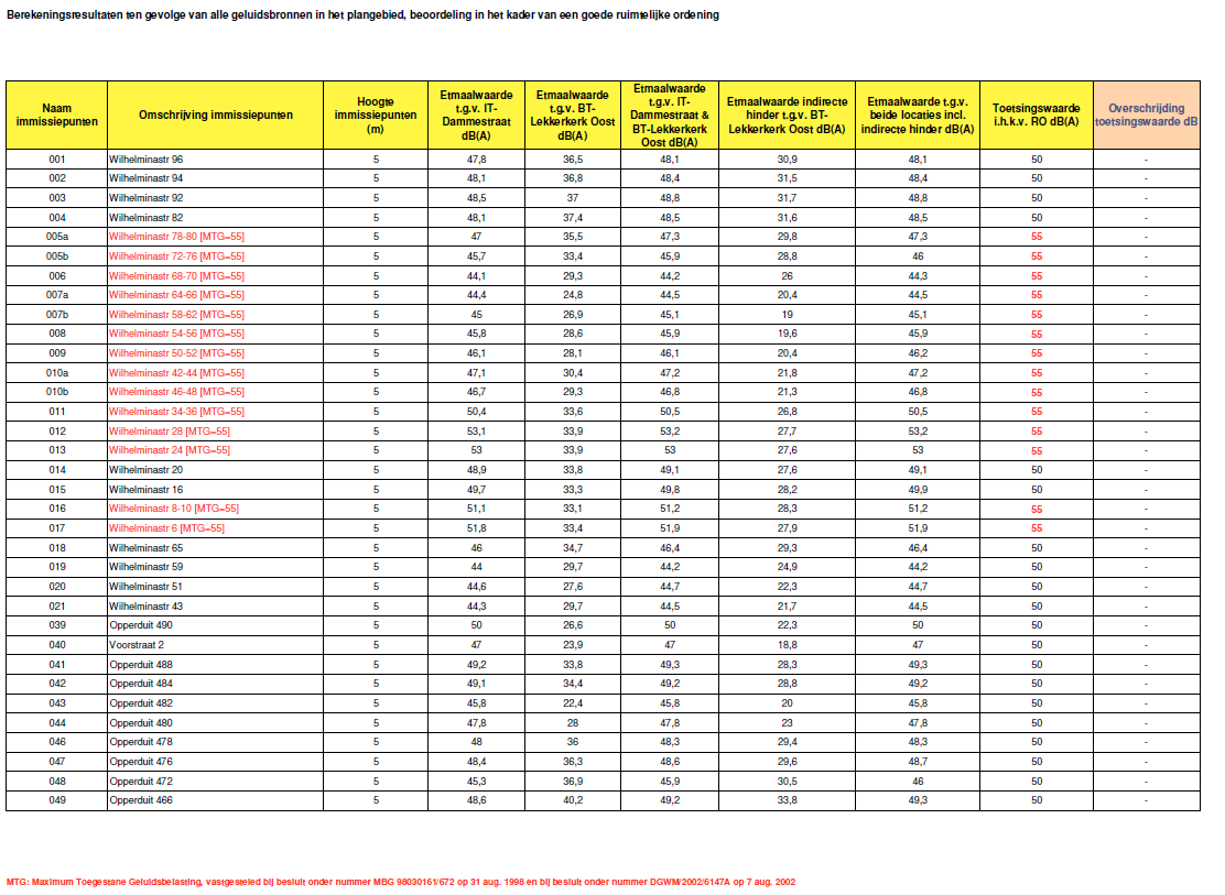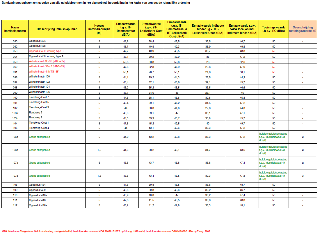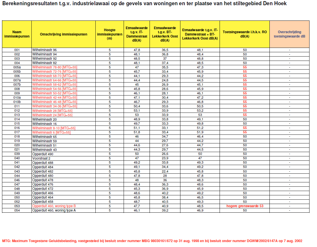 Voor een deel van de bestaande woningen gelegen aan de Wilhelminastraat die in de geluidszone van het industrieterrein Dammestraat zijn gelegen zijn bij besluit van 31 augustus 1998, onder MBG 98030161/672, de maximum toegestane geluidsbelastingen (MTG’s) vastgesteld van 55 dB(A). Tevens is bij besluit van 7 augustus 2002, onder nummer DGWM/2002/6147A voor 45 woningen (nieuwbouwlocatie Tiendhoek II te Lekkerkerk) hogere grenswaarden vastgesteld van 55 dB(A). Om de vastgestelde MTG’s en de hogere grenswaarden te bewaken en deze niet te laten toenemen, wordt daarom voor de normstelling ter plaatse van deze woningen uitgegaan van de gecumuleerde geluidsbelasting van 55 dB(A) etmaalwaarde t.g.v. alle aanwezige en toekomstige geluidsbronnen in het gebied. Ter plaatse van de overige woningen in het gebied wordt gestreefd naar een cumulatieve geluidsbelasting van 50 dB(A) etmaalwaarde.