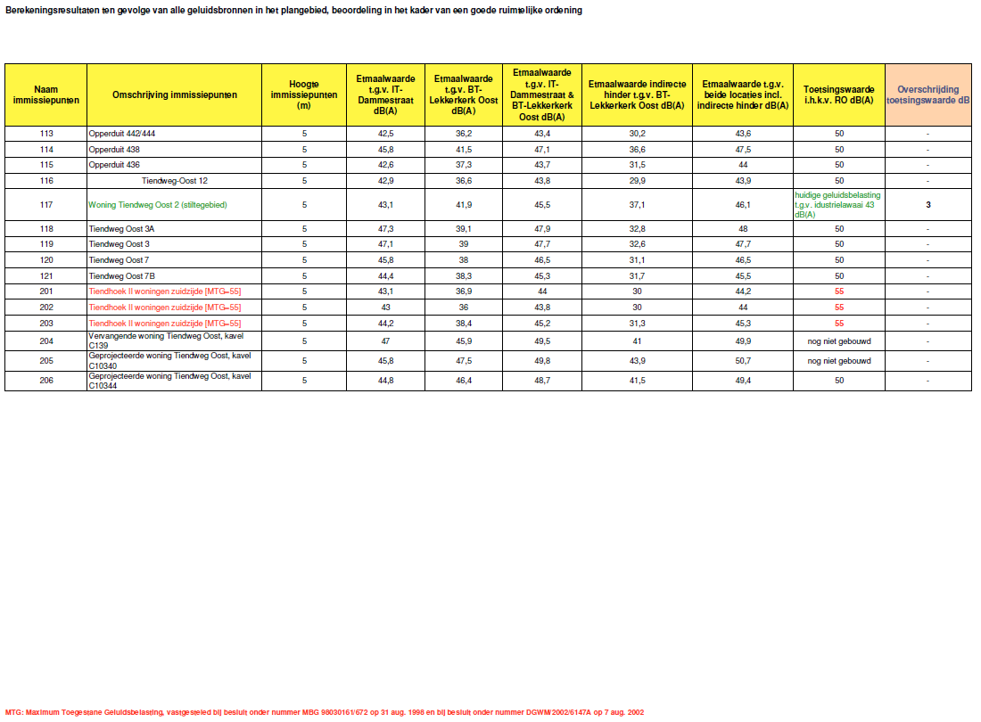 Voor een deel van de bestaande woningen, gelegen aan de Wilhelminastraat, die in de geluidszone van het industrieterrein Dammestraat zijn gelegen zijn bij besluit van 31 augustus 1998, onder MBG 98030161/672, de maximum toegestane geluidsbelastingen (MTG’s) vastgesteld van 55 dB(A). Tevens is bij besluit van 7 augustus 2002, onder nummer DGWM/2002/6147A voor 45 woningen (nieuwbouwlocatie Tiendhoek II te Lekkerkerk) hogere grenswaarden vastgesteld van 55 dB(A). Teneinde hinder te voorkomen en om de vastgestelde MTG’s en de hogere grenswaarden te bewaken, wordt daarom voor de normstelling ter plaatse van deze woningen uitgegaan van de gecumuleerde geluidsbelasting van 55 dB(A) etmaalwaarde als gevolg van het bedrijventerrein Lekkerkerk Oost en het industrieterrein Dammestraat. Ter plaatse van de overige woningen in het gebied wordt gestreefd naar een cumulatieve geluidsbelasting van 50 dB(A) etmaalwaarde. Omdat met deze norm wordt aangesloten bij de voorkeursgrenswaarde zoals die voor industrielawaai in de Wet geluidhinder is opgenomen. Op deze manier zal het bestaande geluidsniveau bij de omliggende woningen niet verhoogd worden.
