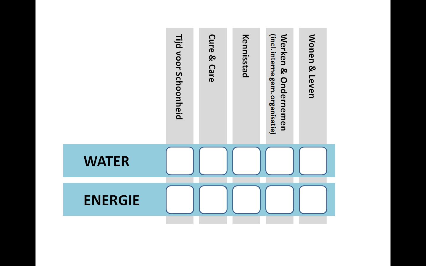 - bewoners, kennisinstellingen, bedrijven, de uiteenlopende organisaties en de overheid zorgen voor experimenten en uitrol van bewezen oplossingen die bijdragen aan het slim omgaan met water en energie. Partijen weten elkaar te vinden en werken samen aan oplossingen;
