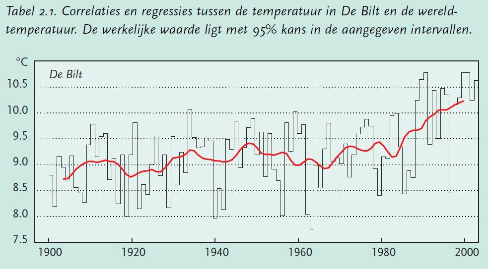 Figuur: trend: stijgende temperatuur.Bron: KNMI 2003