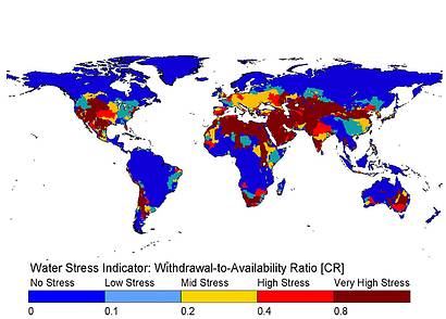 In onderstaande figuur wordt het idee van ‘water stress’ geïllustreerd. Water stress ontstaat wanneer er sprake is van onbalans tussen het gebruik van water en het aanbod ervan, dus de waterbronnen. Uit deze figuur blijkt dat aan het eind van de vorige eeuw, het plaatje visualiseert de situatie in 1999, op veel plaatsen sprake was van matige tot zeer hoge stress.
