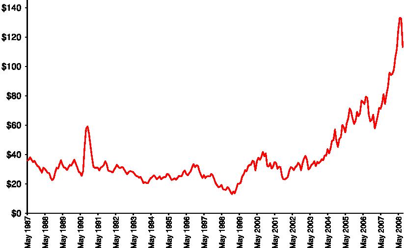 Figuur: maandelijkse gemiddelde Brent olieprijzen van mei 1987 – augustus 2008.