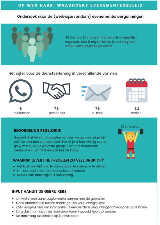 Uit het onderzoek komt naar voren dat de dienstverlening hoog scoort. De organisaties geven wel aan dat de informatieverstrekking duidelijker en beter kan en de regeldruk vrij hoog is. Hierbij wordt aangegeven dat het veel tijd kost om een vergunning aan te vragen, veel informatie aangeleverd moet worden en de manier van aanvragen omslachtig is. Verder is aangegeven dat er duidelijkheid moet komen over regels die gelden voor evenementen. De uitkomsten van het onderzoek zijn samengevat in een factsheet, deze staat in bijlage 1.