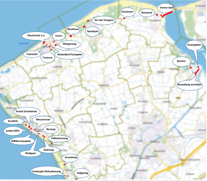 Aan dit kaartbeeld kunnen geen rechten worden ontleend. Een beter kaartbeeld, met een nauwkeurige tekening per locatie, staat vermeld op de website van de gemeente Veere.