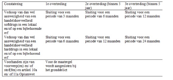 Uitgangspunt voor lokalen is dat bij het aantreffen van voor de handel bestemde drugs (in een grotere hoeveelheid dan voor eigen gebruik) altijd direct wordt gesloten. Indien er sprake is van (meerdere) verzwarende omstandigheden kan voor langere tijd worden gesloten, zie de indicatorenlijst.