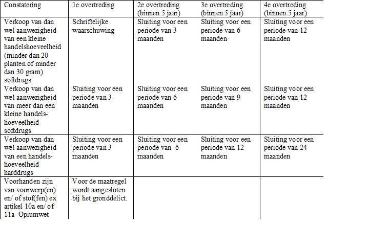 Indien handel in softdrugs wordt geconstateerd nadat er al een maatregel is opgelegd voor de handel in harddrugs, wordt de maatregel opgelegd die hoort bij de tweede of volgende constatering van handel in softdrugs. Indien handel in harddrugs wordt geconstateerd nadat er al een maatregel is opgelegd voor handel in softdrugs, wordt de maatregel opgelegd die hoort bij de tweede of volgende constatering voor handel in harddrugs.