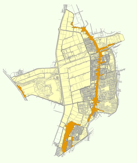 Figuur 1 Plangebied Langedijk. De lintbebouwing is aangegeven met de kleur oker.