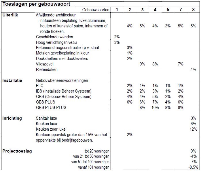 Voor de verschillende gebouwen worden de toeslagen in percentages gegeven.
