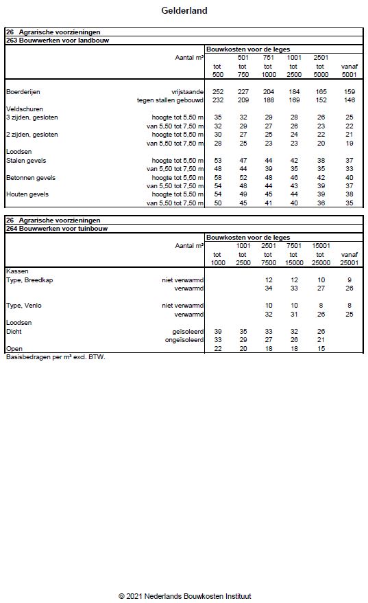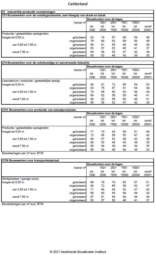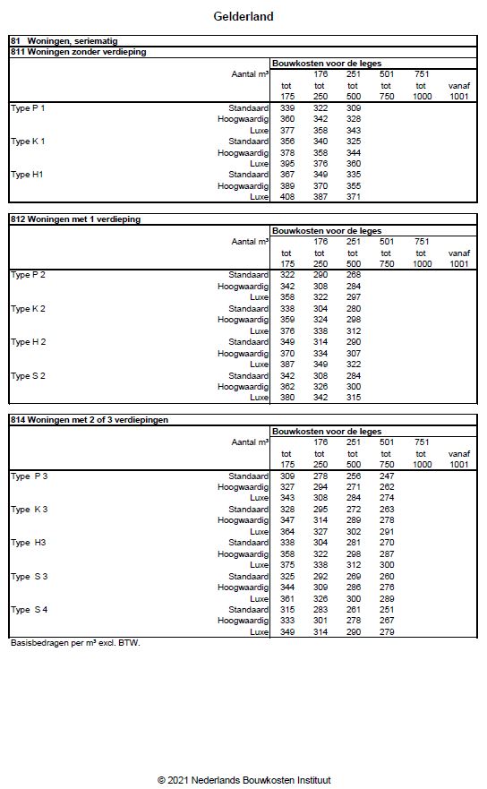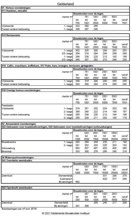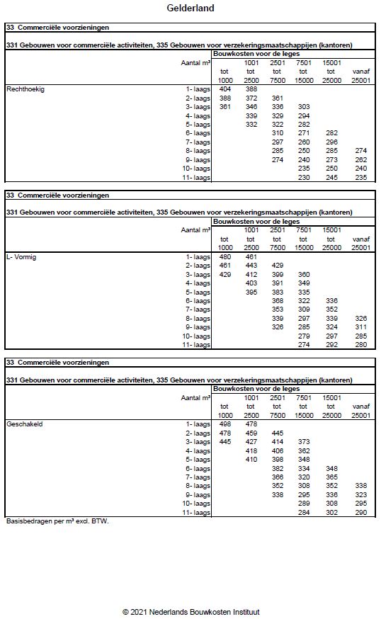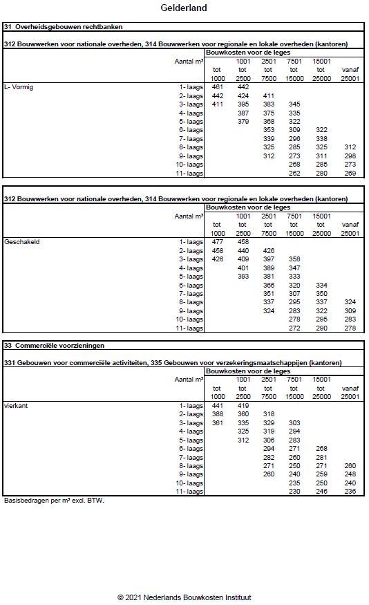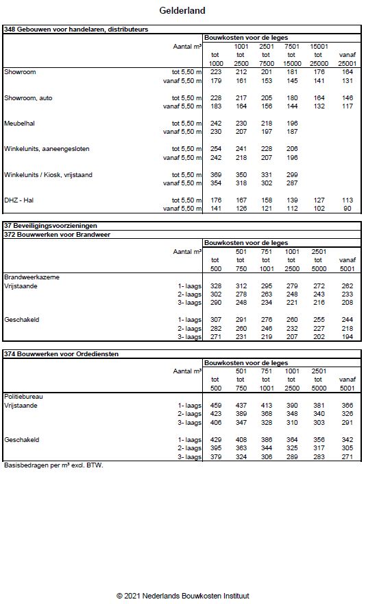 In de tabellen worden de basisbedragen per m3 en per m2 gegeven. De basisbedragen zijn vaak afhankelijk van het aantal m3 of m2, maar ook van de hoogte van de gebouwen. Ook het type gebouw en het uitvoeringsniveau heeft invloed op de basisbedragen gebouwen. Deze worden dan ook vermeld waar dit nodig is.
