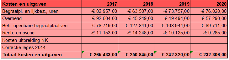 De jaarlijks kosten voor beheer en onderhoud (groen onderhoud, grafwerkzaamheden, administratie, paden en gebouwen) van de begraafplaats worden zo veel als mogelijk betaald uit de binnengekomen grafrechten. De inkomsten dekken niet de uitgaven. Het is onduidelijk hoe dit tekort wordt aangevuld.