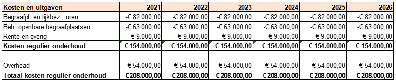 Op dit moment wordt een groot deel van de reguliere onderhoudskosten gedekt door de inkomsten uit begraafplaatsrechten. Groot onderhoud daarentegen wordt vaak aangevraagd met een apart raadsvoorstel. Deze werkwijze is ad-hoc, het overzicht van alle toekomstige kosten ontbreekt en deze werkwijze is afwijkend ten opzichte van de andere beheerelementen.
