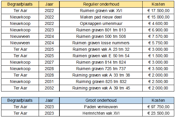 Onderdelen die vallen onder de kosten voor groot onderhoud zijn vernieuwen van paden, ophogen en herinrichten van delen van de begraafplaatsen aanbrengen van drainage, het opknappen van de parkeerplaats in Ter Aar, het vervangen van begraaftoestellen, bekisting en waterpunten. Voor een deel van deze kosten is krediet aangevraagd met raadsvoorstellen.