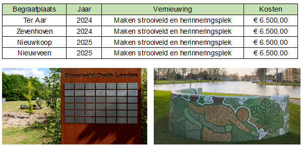 Ter Aar is in 2019 een ruiming van algemene graven uitgevoerd. Mede hierdoor is er voorlopig nog voldoende capaciteit in Ter Aar beschikbaar. Ook is de parkeerplaats in Ter Aar opgeknapt. In Zevenhoven is in 2018 in overleg met de kerk de ingang van de begraafplaats verplaatst en het pad geheel vernieuwd. Er zijn urnentuinen aangelegd in Nieuwkoop en Ter Aar. In 2020 is de Aula in Ter Aar overgedragen naar uitvaartondernemer Keur&Keur. Zij hebben het pand geheel opgeknapt en omgevormd tot een herinneringshuis met 24 uurs rouwkamer. Er zijn folders gemaakt over begraven in de gemeente Nieuwkoop en de entree borden bij de ingangen van de begraafplaatsen zijn vernieuwd. En er is een herinneringsmonument geplaatst voor overleden kinderen op de begraafplaats in Nieuwkoop.