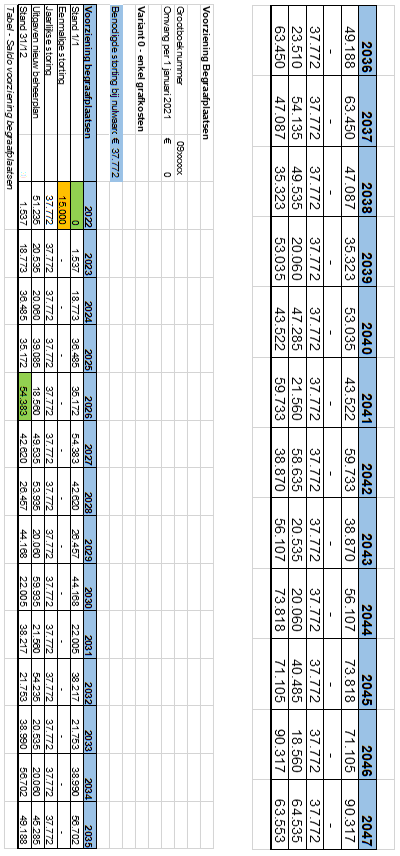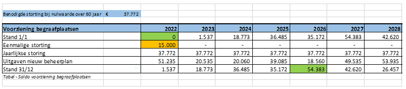 Een eerste éénmalige storting in de voorziening van €15.000 is noodzakelijk omdat er in de komende vijf jaar veel activiteiten gepland staan om uit te voeren. Naast het ruimen van graven wordt ook het onderhoud aan de urnenmuur, grafbekisting, graflift en bijvoorbeeld het herinneringsmonument en het laten maken van naamplaatjes meegenomen. Al deze kosten (totaal €2.281.300 voor de komende 60 jaar) worden ondergebracht in de nieuwe voorziening begraafplaatsen. De jaarlijkse storting in de voorziening bedraagt €37.772. Hiermee kan het beheer en onderhoud van de begraafplaatsen de komende jaren betaald worden. Er is een doorrekening gemaakt van de voorziening voor de komende 20 jaar.