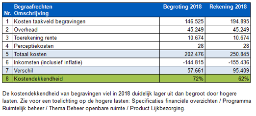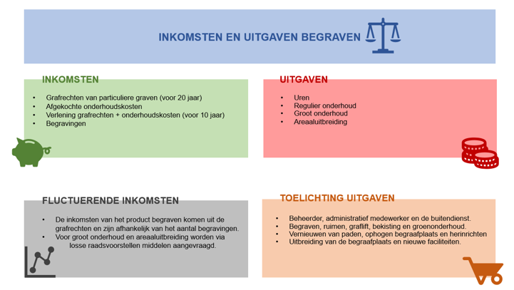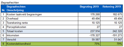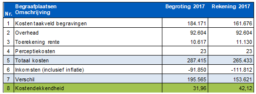 De afgelopen 5 jaar waren gemiddeld 79% van de kosten (uren, overhead en kosten voor regulier onderhoud) gedekt uit de inkomsten (de begraafplaatsrechten). De tekorten kwamen ten laste van het begrotingssaldo. Groot onderhoud, grote vervangingen en investeringen worden tot op heden per activiteit aangevraagd in de voorjaars- en decembernota of met een apart raadsvoorstel.