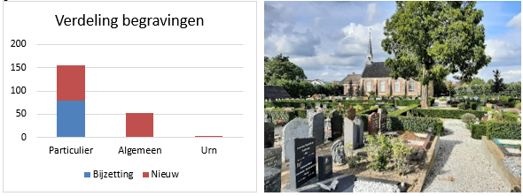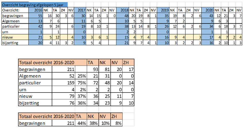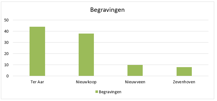 Een overzicht van de verdeling van de begravingen over de begraafplaatsen staat hierboven weergegeven: