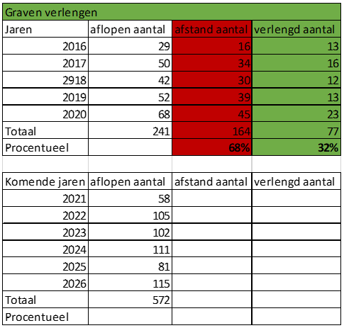 Begraaplaatsrechten worden altijd vooruitbetaald. Na 20 jaar kunnen de particuliere graven verlengd worden met 10 jaar. De afgelopen 5 jaar koos 32% van de rechthebbenden hiervoor. Dit betekent dat er de afgelopen 5 jaar 164 graven beschikbaar zijn gekomen om te ruimen en opnieuw uit te geven. Dit zijn echter allemaal enkele tussenliggende graven wat het ruimen kostbaar en onhandig maakt. We halen bij opzegging de grafsteen van het graf en beplanten het graf tijdelijk met bloeiende planten zodat het de biodiversiteit verbetert en er geen kale plekken ontstaan. We ruimen graven zoveel mogelijk per vak. Bij een ruiming worden de stoffelijke resten bijgezet in een verzamelgraf op de begraafplaats en plaatsen we een naamplaatje op de herinneringszuil. Het cijferoverzicht van de verlopen graven en verlengingen wordt weergegeven in bijlage 4.