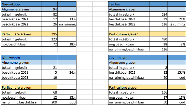 Daarnaast zijn er graven uitgegeven voor 100 jaar waarvan het nu heel lastig is om nog rechthebbenden te achterhalen. Een overzicht van de huidige beschikbare graven op de begraafplaatsen is te vinden in bijlage 5.