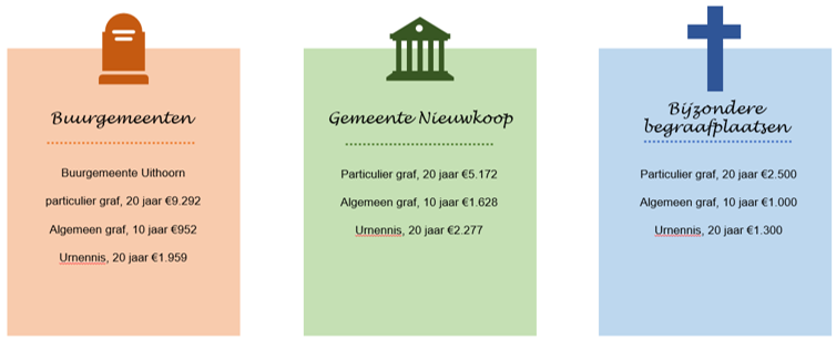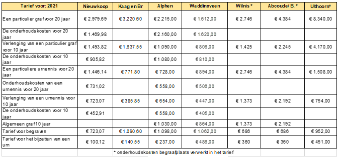 De tarieven in de gemeente Nieuwkoop zijn de afgelopen jaren jaarlijks met 5% extra verhoogd. Dit is gelijktijdig met de uitbreiding van de begraafplaats in Nieuwkoop besloten in 2015 om te streven naar volledige kostendekkendheid. Het huidige tarief is gemiddeld in vergelijking met onze buurgemeenten. De tarieven van de bijzondere begraafplaatsen bij de kerken in onze gemeente liggen lager. Het verschil met onze buurgemeenten is met name te zien in de kosten voor een urnennis. Een compleet overzicht van de tarieven en hoe onze buurgemeenten omgaan met het beheer en onderhoud van de begraafplaatsen is te lezen in bijlage 6.