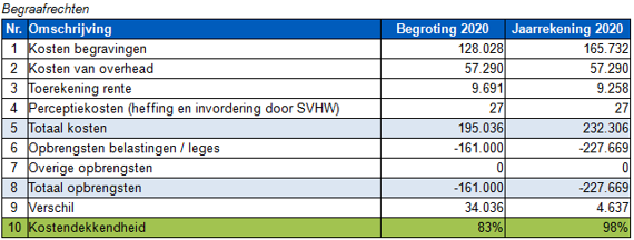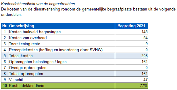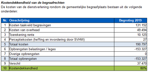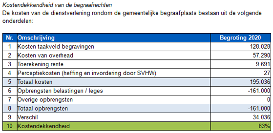Er is vaak een tekort, het ene jaar groter dan het andere jaar. Deze wordt gedekt uit de algemene reserve. Het voornemen is om dit jaar de beheerverordening te herzien en dan aansluitend ook de lijkbezorgingsrechten onder de loep te nemen om zo te zorgen dat het weer (zo goed als) kostendekkend is.