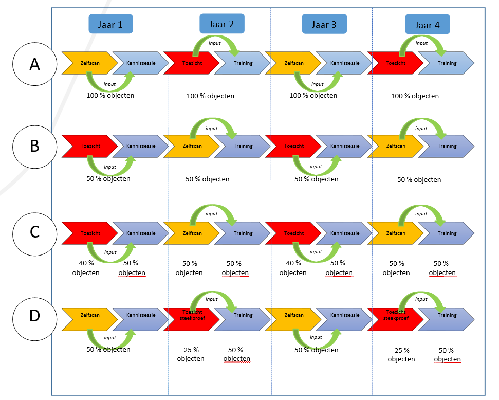 In de vierjarige cyclus worden alle objecten twee keer fysiek gecontroleerd, twee keer via een zelfscan gecontroleerd en wordt er vier keer een gedrag beïnvloedende interventie aangeboden.