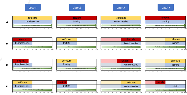 In de vierjarige cyclus wordt 50% van de objecten één keer fysiek gecontroleerd, alle objecten worden één keer gecontroleerd via een zelfscan en er wordt aan alle objecten twee keer een gedrag beïnvloedende interventie aangeboden.