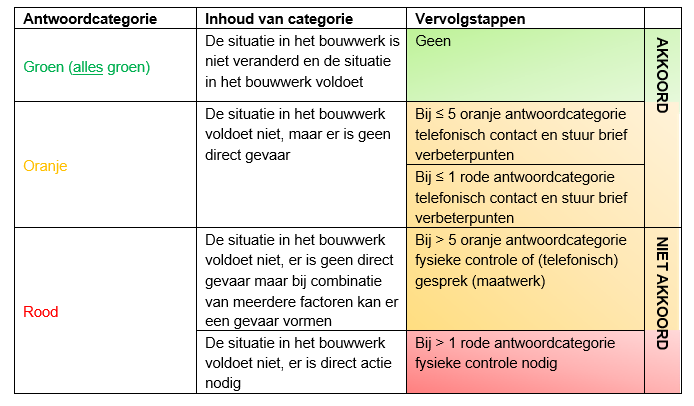 De antwoorden binnen de rode categorie, hebben dusdanig invloed op de situatie in het bouwwerk en op de brandveiligheid in het bouwwerk dat een fysieke controle als vervolgstap wordt ingezet.
