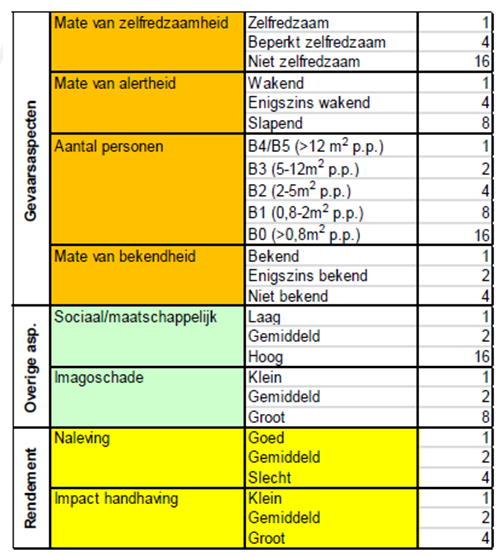 De prioritering van de gebruiksfuncties is uitgevoerd op basis van een aantal aspecten die mogelijk de omvang van de gevolgen van een brand beïnvloeden. Het betreft de volgende aspecten: