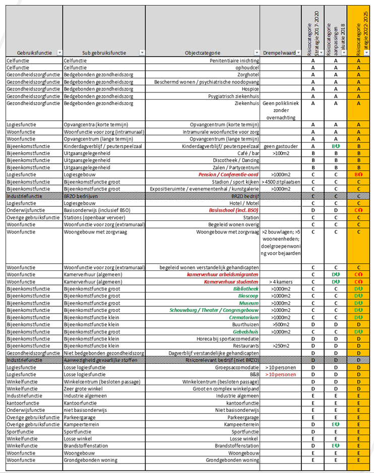 Deze gebouwfuncties kunnen op veel manieren worden ingedeeld. In de brandveiligheid wordt hiervoor meestal de indeling van de technische bouwwetgeving (Bouwbesluit 2012 / Bbl) gebruikt waarin een aantal gebruiksfuncties en sub-gebruiksfuncties zijn opgenomen. In 2016 is onder leiding van Efectis en in samenspraak met de deelnemende gemeenten een prioritering in gebruiksfuncties vastgesteld. De brandweer heeft in 2020 Efectis gevraagd om deze methode van prioriteren opnieuw te valideren4. Deze prioritering is nu ook gebruikt als basis voor de nieuwe strategie.