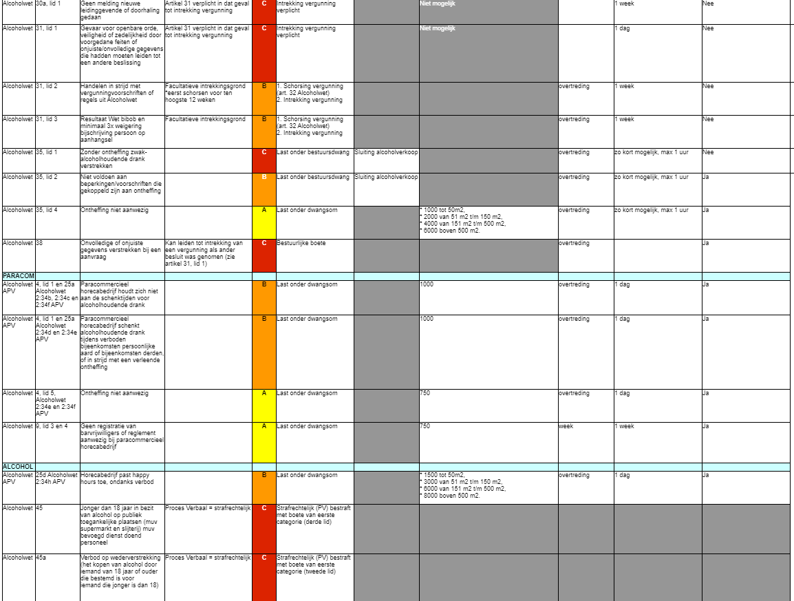 In artikel 43a van de Alcoholwet is de verplichting opgenomen tot een handhavingsstrategie voor deze wet. Deze strategie is vastgelegd in het Preventie- en Handhavingsplan ter uitvoering van de Alcoholwet en is vastgesteld door de gemeenteraad. Hieruit blijkt dat een jaarlijkse risicoanalyse moet worden opgesteld voor verkooppunten van alcoholhoudende drank. Deze analyse bepaalt de controlefrequentie. Ook wordt een risico-categorisering (A, B en C) gehanteerd waarbij risicovollere overtredingen zwaarder worden bestraft (volgend uit artikel 7.1 Alcoholbesluit). Ten slotte volgt hieruit dat na het opleggen van een sanctie altijd een herinspectie plaatsvindt. De uitwerking van de strategie is hieronder opgenomen.