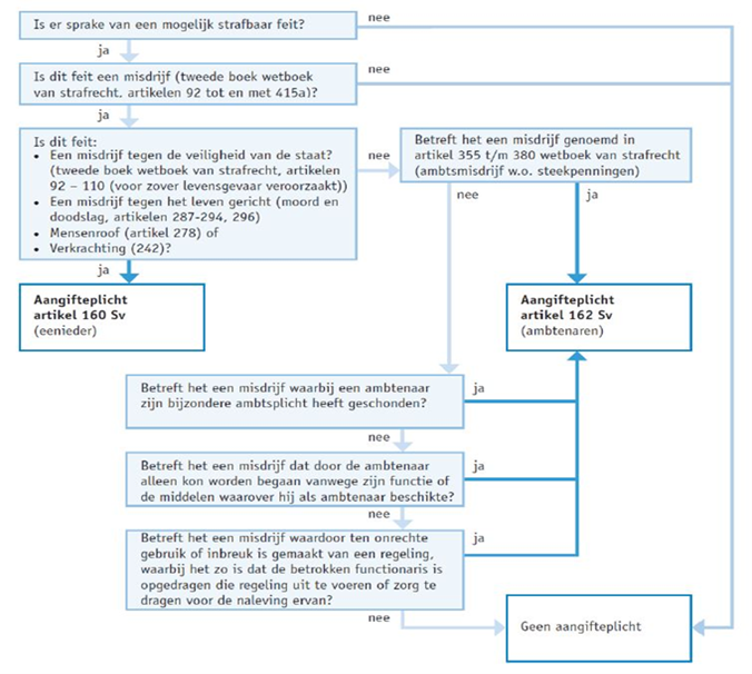 Het kan zijn dat gemeente Hoorn naar aanleiding van de melding verplicht is om aangifte te doen. Dat kan al bij de eerste inschatting van de melding zijn. Het is ook mogelijk dat gaandeweg het onderzoek blijkt dat aangifte noodzakelijk is. Intern fei¬tenonderzoek en een strafrechtelijk onderzoek door de politie sluiten elkaar niet uit, maar kunnen elkaar opvolgen of tegelijkertijd plaatsvinden. De werkgever blijft hoe dan ook verantwoordelijk voor het arbeidsrechtelijke traject.