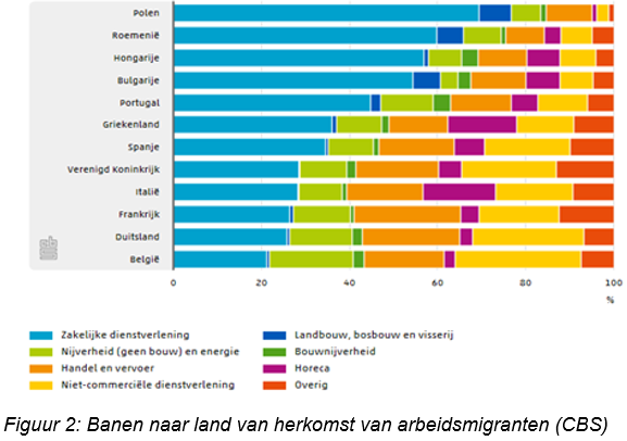 Een groot deel van de buitenlandse werknemers heeft een baan in de zakelijke dienstverlening, waarbij het vooral om uitzendbureaus gaat. Vooral werknemers afkomstig uit Midden- en Oost-Europese landen behoren hiertoe en zijn in de praktijk in andere sectoren werkzaam. Daarnaast zijn relatief veel werknemers uit Polen, Roemenië en Bulgarije werkzaam in de landbouw (onder andere ook de fruitteelt). Veel tijdelijke internationale werknemers verblijven minder dan een jaar in Nederland, maar er is ook een grote groep die volgens een onderzoek van SEO langer of zelfs permanent in Nederland verblijft. Landelijk gezien gaat het om zo’n 40% die hier 4 jaar of langer verblijft. Het onderzoek van SEO maakt duidelijk dat naar schatting zo’n 37% van de tijdelijke internationale werknemers uit Midden- en Oost-Europa (de zogeheten ‘MOE-landers’) zich laten inschrijven in de BRP (Basisregistratie Personen). Een onderzoek van de provincie Gelderland geeft aan dat in de provincie zo’n 45 tot 55% van de tijdelijke internationale werknemers zich laat inschrijven.