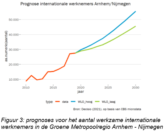 Het onderzoeksbureau Decisio heeft in 2021 in opdracht van de provincie Gelderland onderzoek gedaan naar het aantal internationale werknemers dat per gemeente in de provincie woont en werkt. Op basis van dit onderzoek worden twee scenario’s voor de toekomstige vraag naar tijdelijke internationale werknemers voor de gehele regio geschetst waar Lingewaard onder valt: het laagscenario (waarin het aantal werkende internationale arbeidskrachten in de regio tussen 2020 en 2030 toeneemt met 54%) en het hoogscenario (waarin het aantal werkende internationale arbeidskrachten in de regio tussen 2020 en 2030 toeneemt met 88% tot 2030).