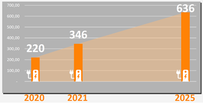 In september 2020 waren er circa 220 openbare laadpalen, In 2021 zijn 346 openbare oplaadpalen nodig en in 2025 zijn er 636 openbare oplaadpalen nodig (zie fig. 1).