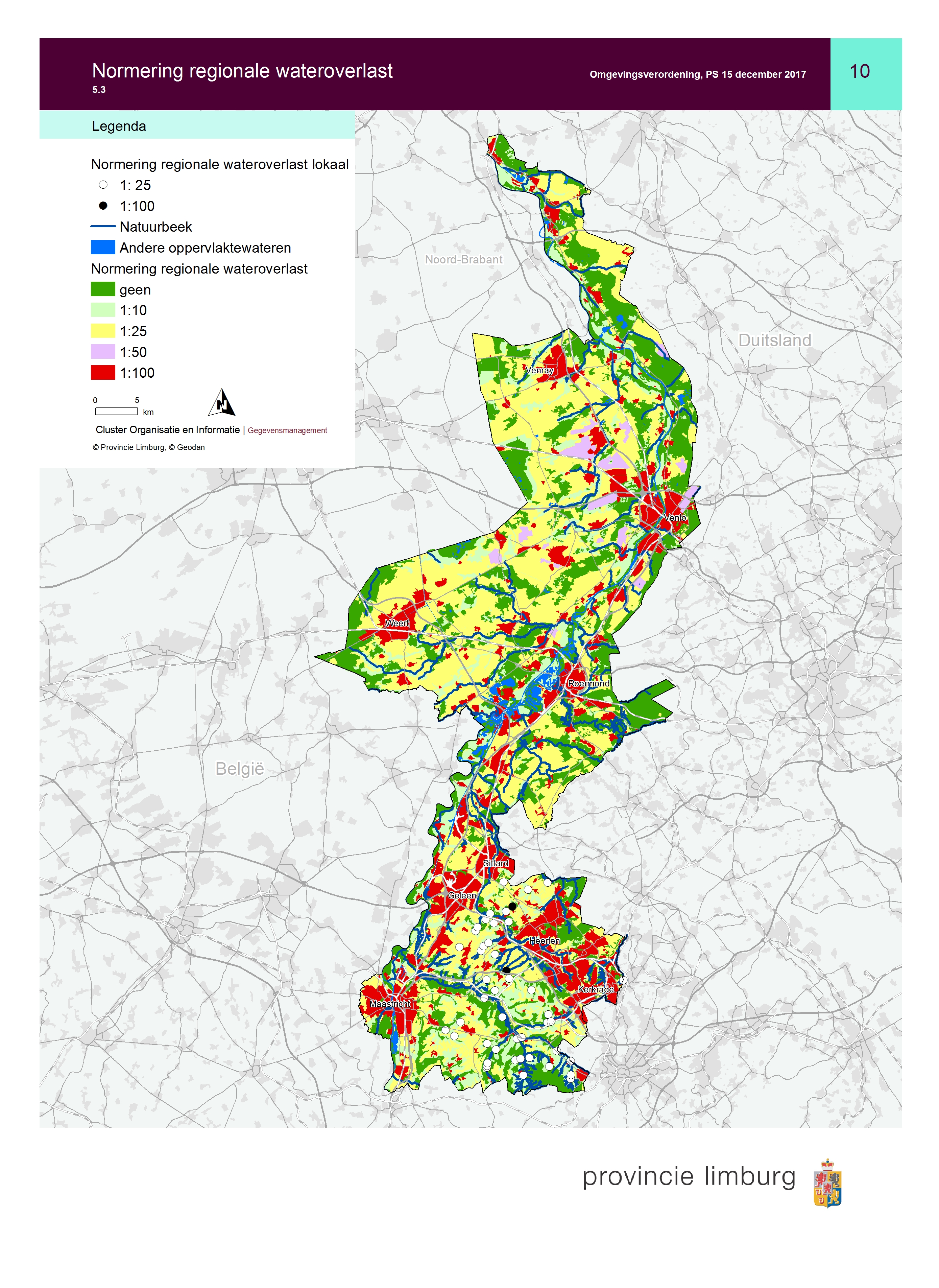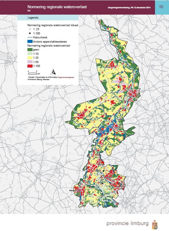 In de Bronsgroene landschapszone waar geen natuurbeek is gelegen (dit zijn overwegend beekdalen) is de norm (1:10) afgestemd op het meest geëigende en meest toegepaste grondgebruik, namelijk grasland. Voor de overige landbouwpercelen in het buitengebied geldt de referentienorm voor akkerbouw (1:25). Voor belangrijke glastuinbouwgebieden is de referentienorm voor hoogwaardige land- en tuinbouw (1:50) toegepast. Voor bebouwde kernen is meestal de referentienorm voor bebouwd gebied (1:100) vastgesteld. Vanwege kosteneffectiviteit kan voor de meeste bebouwde gebieden in het Zuid-Limburgse Heuvelland slechts een 1:25 norm worden vastgesteld. Bebouwd gebied in Zuid-Limburg dat lokaal wordt beschermd door regenwaterbuffers is ten gevolge van de kaartschaal door een stip aangegeven.