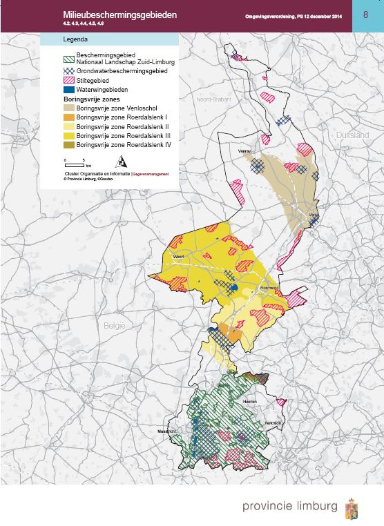 Voor waterwingebieden, grondwaterbeschermingsgebieden, de Roerdalslenk en de Venloschol bevat de omgevingsverordening regels voor boorputten en het roeren van de grond. In het Nationaal Landschap Zuid-Limburg gelden regels voor het roeren van grond.