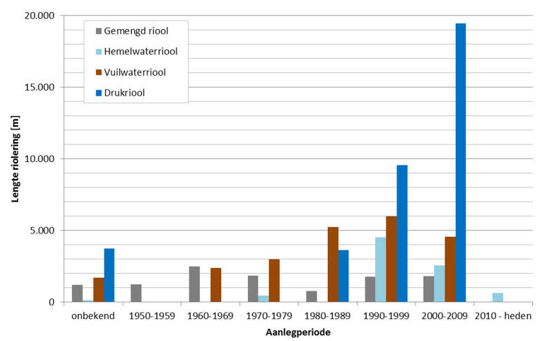 Bekend is dat de data in het rioolbeheersysteem niet geheel up-to-date zijn. Voor circa 5% ontbreekt bijvoorbeeld het aanlegjaar in de brondata. Wel is te zien dat vanaf de jaren ’90 begonnen is met het aanleggen van gescheiden rioolstelsels en het afkoppelen van verhard oppervlak door het aanleggen van hemelwaterriolen. Aanleg van nieuw gemengd riool komt niet voor. Circa 60% van de riolen zijn onderheid. De overige 40% is ‘zwevend’ riool. Dit is een aandachtspunt voor enerzijds de te hanteren eenheidsprijzen voor rioolvervanging en anderzijds de verwachte technische levensduur. In het Achtergrondendocument is dit nader uitgewerkt.