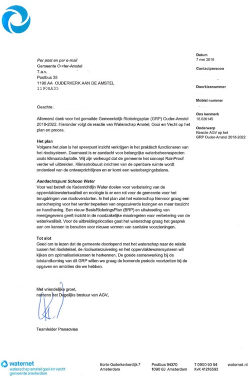 Conform de Wet milieubeheer (art. 4.23) is het GRP opgesteld in samenspraak met Waternet, als uitvoeringsorganisatie van de het waterschap Amstel, Gooi en Vecht (AGV). Ook de provincie Noord- Holland is in het proces uitgenodigd. Het waterschap heeft op ambtelijk niveau aangegeven geen bezwaren te hebben tegen de inhoud van dit GRP en de goede samenwerking de komende periode graag voort te willen zetten. Wel heeft AGV/Waternet per brief van 7 mei 2018 aangegeven graag nog een aanscherping te zien voor het verder beperken van ongezuiverde lozingen (riooloverstorten) en meer toezicht en handhaving.