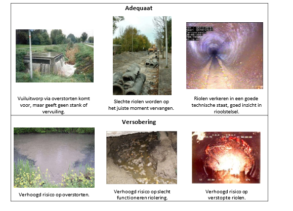 De volgende figuur geeft enkele sfeerbeelden weer bij de invulling van de zorgplicht stedelijk afvalwater. De bovenste rij geeft het beeld weer bij aan adequate invulling, de onderste rij geeft de mogelijke consequenties van een versobering aan.