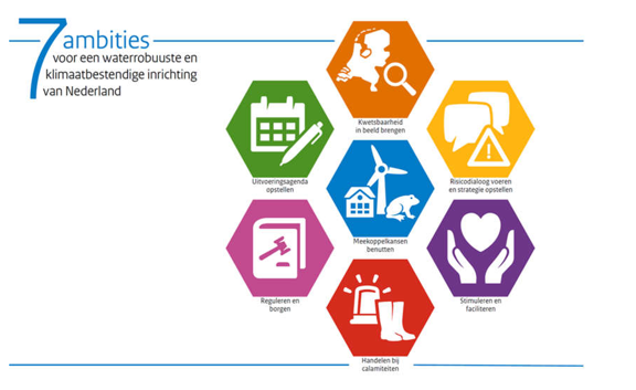Het Deltaprogramma voor 2018 is op Prinsjesdag 2017 verschenen en bevat voor het eerst een Deltaplan Ruimtelijke Adaptatie: een gezamenlijk plan van gemeenten, waterschappen, provincies en het Rijk dat de aanpak van wateroverlast, hittestress, droogte en de gevolgen van overstromingen versnelt en intensiveert. Dit is vertaald in een 7-tal ambities, om de voornemens ook daadwerkelijk ingevuld te krijgen.